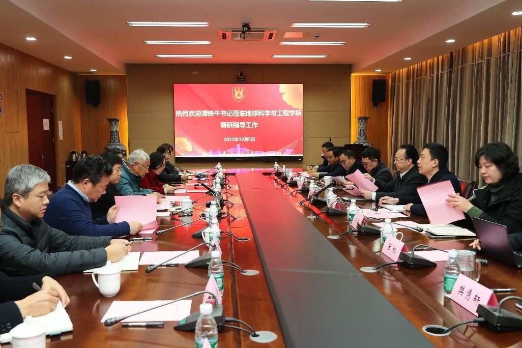 谭铁牛听取了学院关于人才培养、服务国家、团队建设、“奋进行动”实施情况、基层党建、团队队伍建设、人才工作、研究生教育、科学研究、国际合作与交流、学院内部控制体系建设等方面的工作汇报。他表示,地科院历史悠久、声誉卓著、人才辈出、团结和谐、共同奋斗、潜力很大、未来可期;他感谢与会代表们开诚布公的发言,对地科院未来的建设发展提出六个“进一步”要求:一是进一步加强政治引领,深入学习贯彻习近平总书记重要讲话精神和重要回信精神,提升政治责任感。二是进一步加强有组织科研,整合资源争取更大的科研项目,产出更有显示度的科研成果。三是进一步加强学科交叉,让传统学科焕发新的活力。四是进一步加强协同创新,加强与兄弟高校和研究所的合作,加大成果转化,牢固树立科研是为了解决科学问题、最终服务国家战略需求的意识。五是进一步加强开放办学,多走出去,多请进来,走向创新、走实服务。要进一步加大国际合作力度,不断提升国际化水平,扩大国际交流,加快建设国际化科研环境,形成具有全球竞争力的开放竞争生态。六是进一步加强队伍建设,优化队伍结构,把现有人才用好,保持队伍可持续发展。