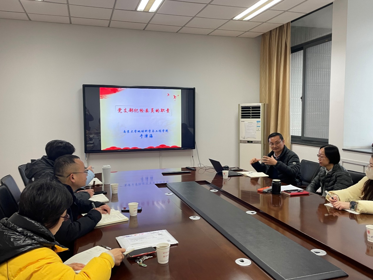 会上,于津海老师带领纪检委员共同学习了《中国共产党党内监督条例》《中国共产党廉洁自律准则》等,从支部纪检委员的重要性、主要职责、监督对象和内容等方面就支部纪检委员如何开展工作进行了详细的阐述,并通过分析典型案例对工作进行了具体的指导,为纪检委员更好开展工作指明了方向。
