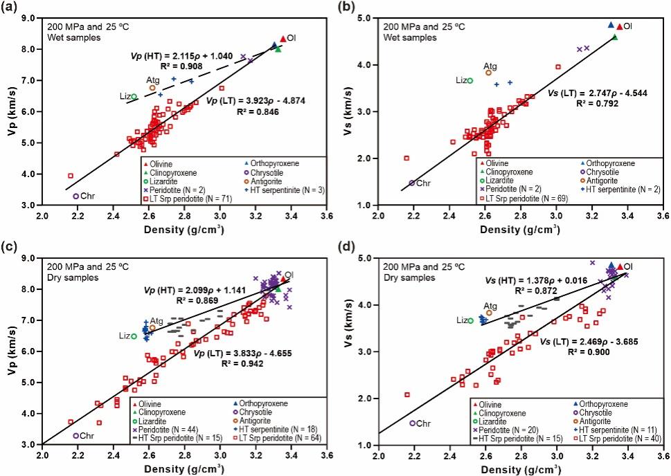 Figure 2. Correlation between seismic velocities and density of serpentinites and serpentinized peridotites at 200 MPa and room temperature.