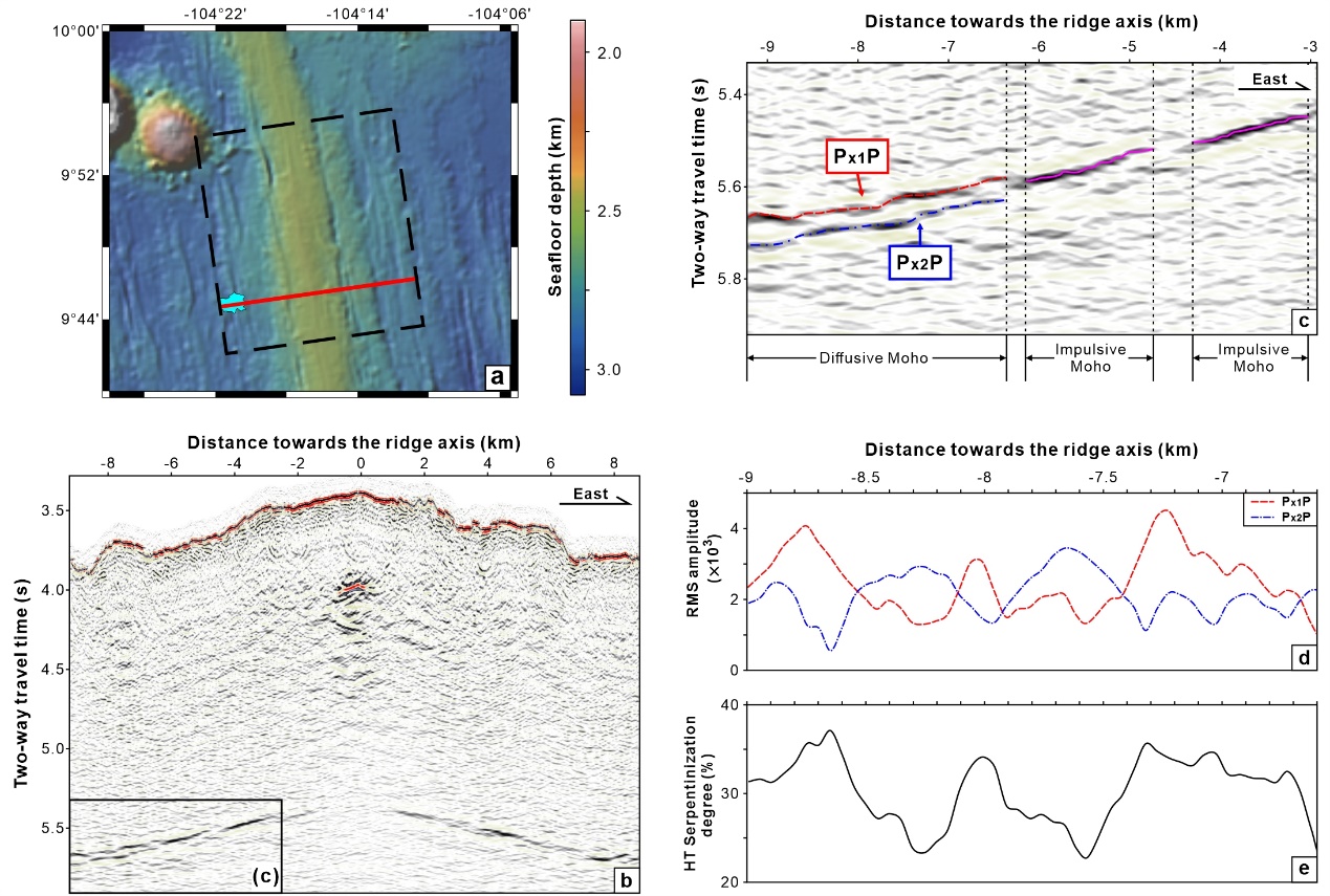 Figure 4. Moho reflections at the East Pacific Rise. (a) Bathymetry map of the East Pacific Rise between 9°40′N and 10°N latitude (Ryan et al., 2009). (b) The multichannel seismic profile across the East Pacific Rise. (c) Expanded view of the Moho at the west flank of the East Pacific Rise. (d) The root‐mean‐square (RMS) amplitude computed along the reflected phases Px1P and Px2P using a 20‐ms window. (e) HT serpentinization degree inferred from RMS amplitude ratio between the Px1P and Px2P.