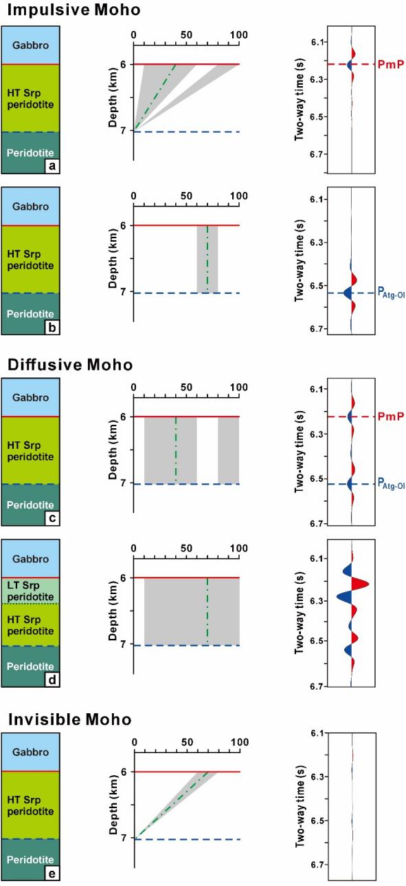 Figure 3. Serpentinization effects on the sharp crust‐mantle boundary and the Moho reflection from this study. Left panels show serpentinization types in the upper mantle; middle panels show degree of serpentinization (gray shading); right panels show zero‐offset synthetic seismograms. Green dashed lines in middle panels mark serpentinization degrees corresponding to the synthetic seismograms. Depth from the seafloor is assumed as 6 km for the bottom of the lower crust.