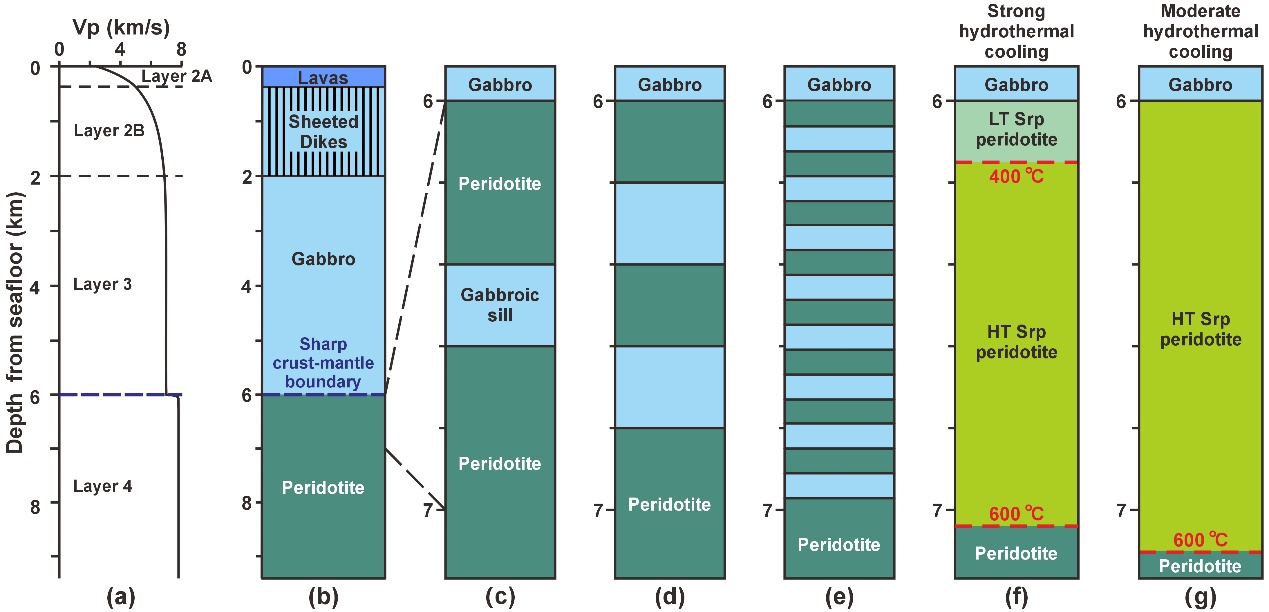 Figure 1. Seismic profile and petrological models of the oceanic lithosphere at a fast-spreading ridge. (a) Seismic layers of the oceanic lithosphere (after Vithana et al., 2019), (b) petrological model of the Penrose-type oceanic lithosphere with a sharp crust-mantle boundary (after Dilek & Furnes, 2014), (c) a layered crust‐mantle boundary with one 200‐m‐thick gabbroic sill, (d) two layers of 200‐m‐thick gabbroic sills, and (e) eight 60‐m‐thick gabbroic sills, (f, g) serpentinization for a sharp crust‐mantle boundary with strong and moderate hydrothermal cooling, respectively. The predicted depths for the 400°C and 600°C isotherms by Maclennan et al. (2005) correspond to the boundaries for low‐temperature serpentinization (LT Srp) and high‐temperature serpentinization (HT Srp), respectively. Note that strong hydrothermal cooling results in a downward transition from low- to high-temperature serpentinization, whereas moderate hydrothermal cooling produces solely high-temperature serpentinization.