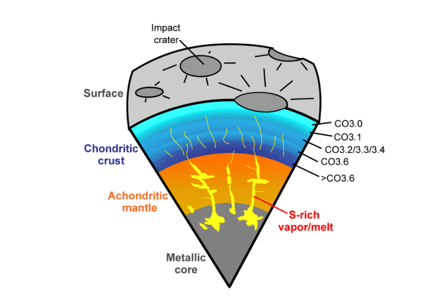 Figure 3. A schematic diagram showing the degassing of sulfur from the core of a partially differentiated planetesimal