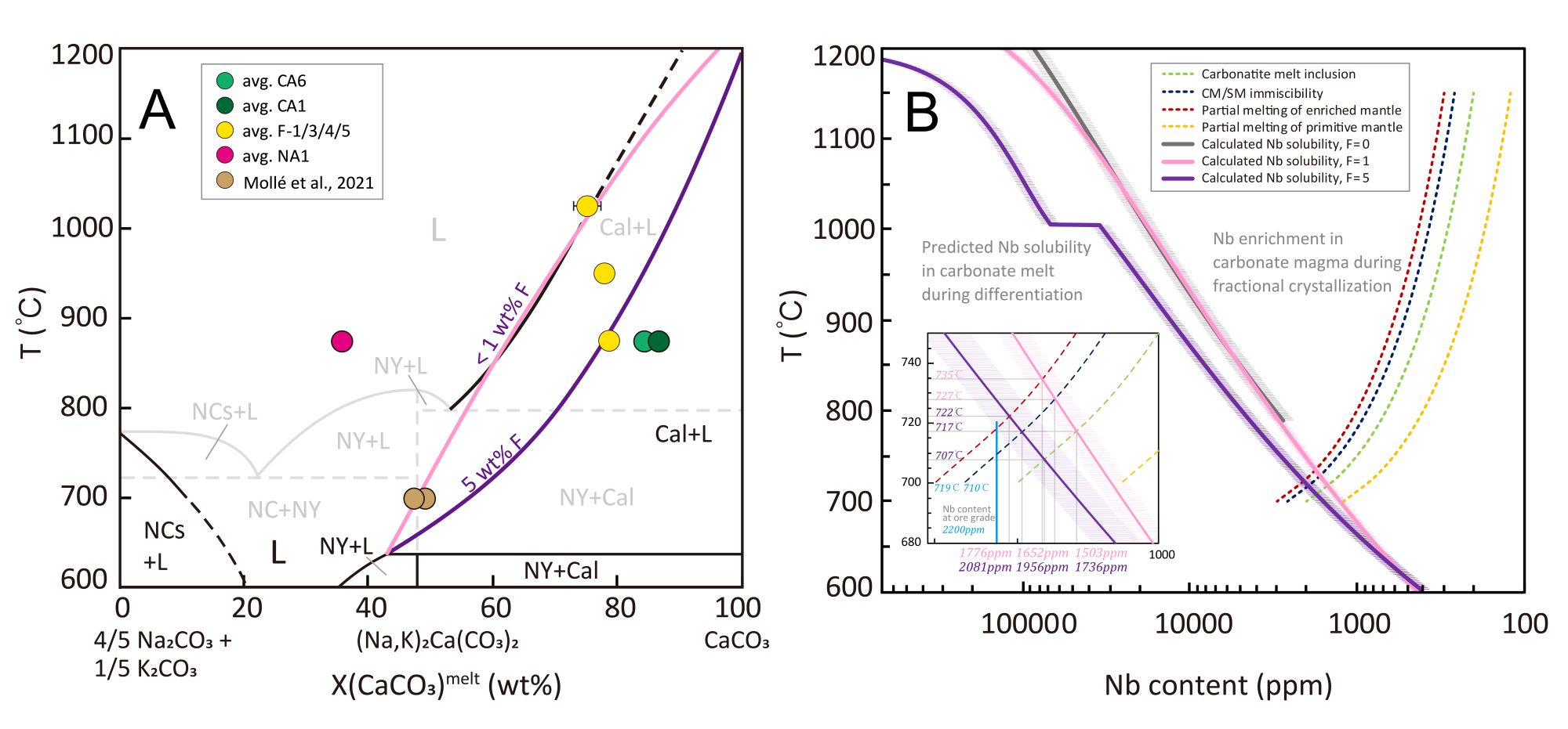 Figure 3. Carbonate phase diagram (A) and the sharp decrease in Nb solubility during carbonatite differentiation (B).