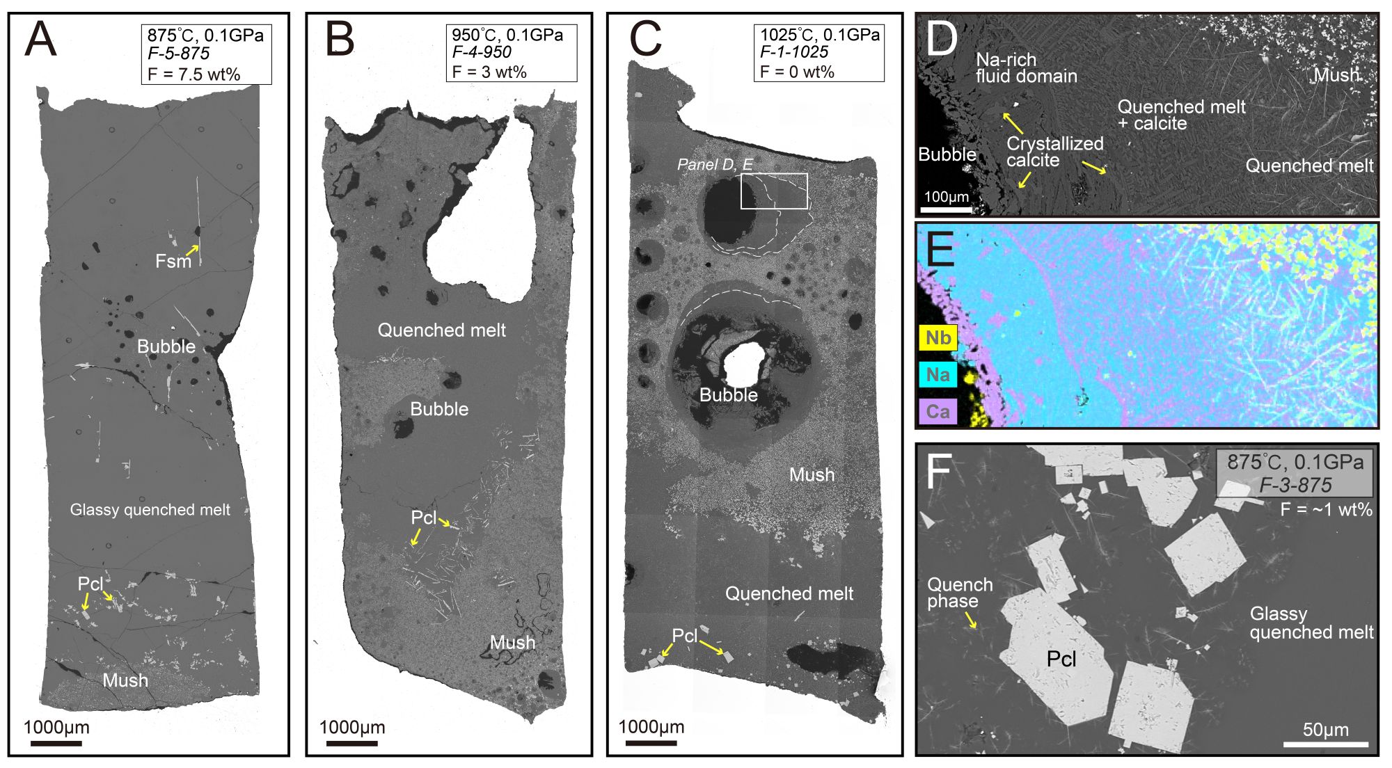 Figure 1. Characterization of experimental products. (A–C) Back-scattered electron (BSE) images of entire sample capsules, showing the morphology of experimental products formed under different temperature and fluorine conditions. (D) Magnified image of the experimental product at 1025 °C, showing the quenched melt and Na-rich fluid regions surrounding vesicles. (E) Energy-dispersive spectroscopy (EDS) elemental maps of the area shown in (D), illustrating the compositional distribution. (F) BSE image showing crystallized pyrochlore, including quenched phases (micron-scale pyrochlore crystals formed during quenching).