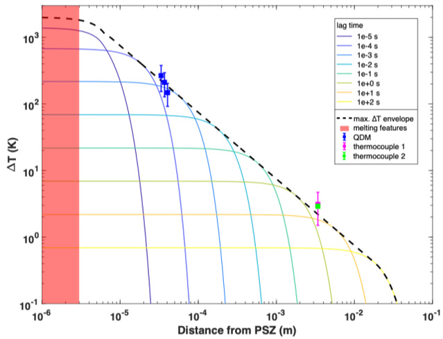 滑移诱发的摩擦生热会提高断层泥和围岩的温度,引起相应的物理、化学变化。估算主滑动带附近的温度变化可以约束生热过程的总热量。如果温度测量能够在足够接近断层的位置上进行,还可以进一步约束可能的断层弱化机制。目前已有多种地质温度计被用于量化摩擦生热引起的升温,如有机热成熟度分析和低温热年代学方法等。虽然这些技术有一些成功应用案例,但它们的空间分辨率较低,普遍在100微米以上,并且需要特定类型的岩石或矿物,而这些特定物质在断层中并不总是存在。