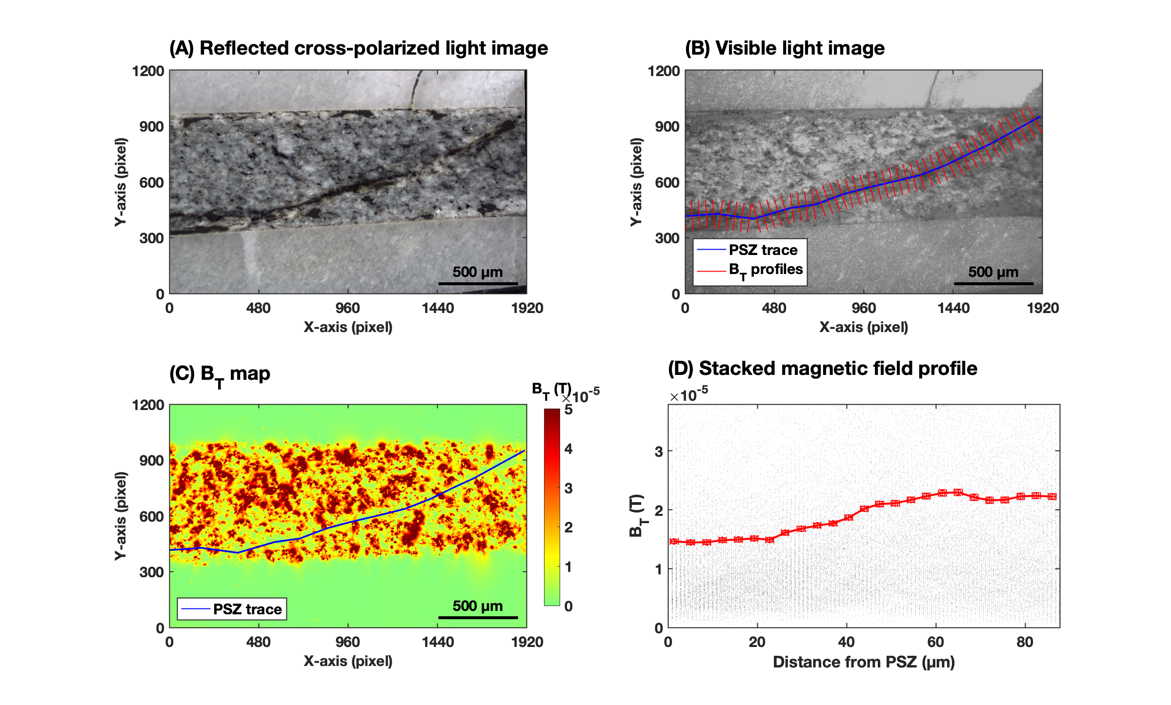 相比之下,铁磁性矿物在地球表面环境中普遍存在。铁磁性矿物在加热时能够发生矿物反应,并改变其磁性特征。由于铁磁性矿物在不同温度下形成,通过比较新形成的矿物与围岩中已存在的矿物,可以约束升温幅度。然而,岩石是热的不良导体,而主滑动带往往只有100微米到数毫米,因此,以往利用铁磁性矿物的全岩尺度的研究空间分辨率较低,不足以精确辨别摩擦生热可能造成的温度差异。此外,基于新形成的铁磁性矿物的测温方法其温度不确定性也较高,可达到数十摄氏度甚至超过100摄氏度。