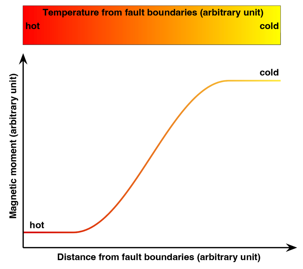 图2: 铁磁性矿物磁性遇热会发生退磁,由断层摩擦造成的升温随与断层主滑动带的距离增大逐渐降低,矿物磁性强度也随之减弱