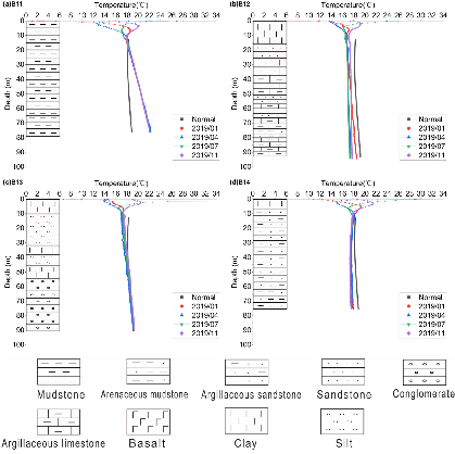 图 2 钻孔内地温深度剖面和钻孔岩性