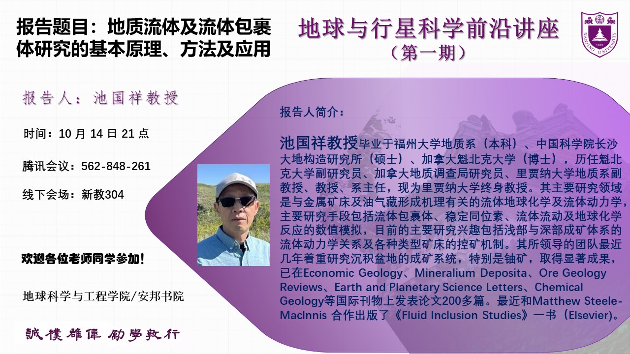池国祥教授是一位在地质流体及流体包裹体研究领域享有盛誉的学者。在池国祥教授的讲座中,他详细介绍了地质流体及流体包裹体研究的基本原理、方法及应用。他强调了流体包裹体作为保存下来的古地质流体标本的重要性,以及在研究流体PVTX(Pressure, volume, temperature and composition, 压力-体积-温度-成分)条件中的作用。池教授还讨论了流体包裹体研究中常见的问题和陷阱,并提出了使用FIA(Fluid inclusion assemblage,流体包裹体组合)概念的重要性。池教授在讲座中也多次与同学们互动,耐心解答他们的问题,并就一些关键概念进行了深入研讨。同学们对池教授的讲座反响热烈,他们表示通过讲座获得了前沿知识和思想启迪。